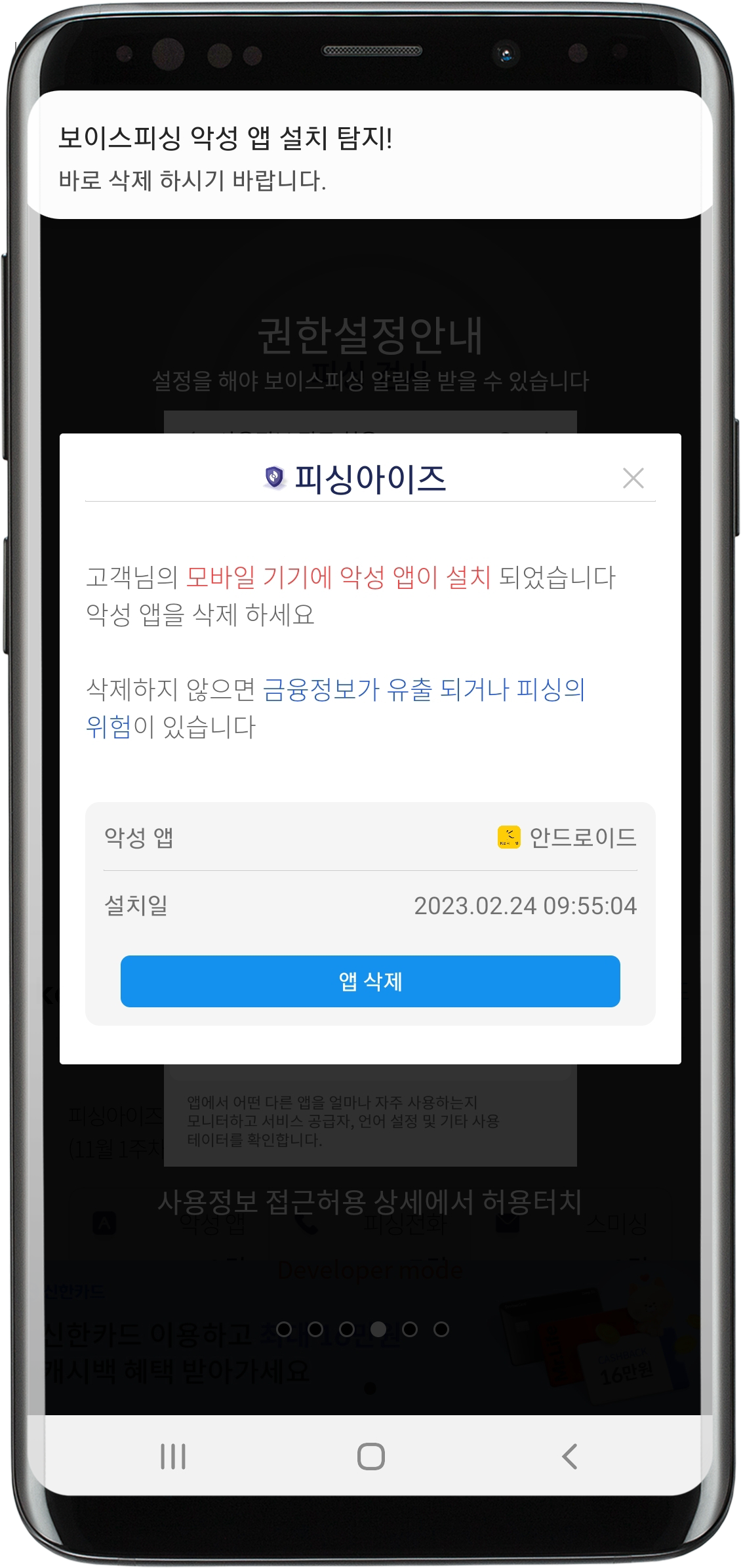 Scammers will convince users to install malicious apps or remote-control apps which then will cause the victim’s phone to be taken over remotely by the fraudster. To prevent this, PhishingEyes will detect abnormal signs of installing and running malicious software or remote-control apps.